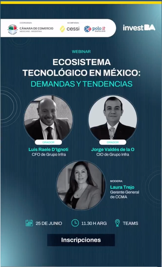 Se llevó a cabo el webinar “Ecosistema Tecnológico en México: demandas y tendencias”, organizado conjuntamente por la Cámara de Comercio Mexicano Argentina (CCMA) y la agencia InvestBA, con el propósito de ofrecer a empresas argentinas del sector IT una visión estratégica sobre el panorama tecnológico mexicano y las oportunidades que este mercado representa.